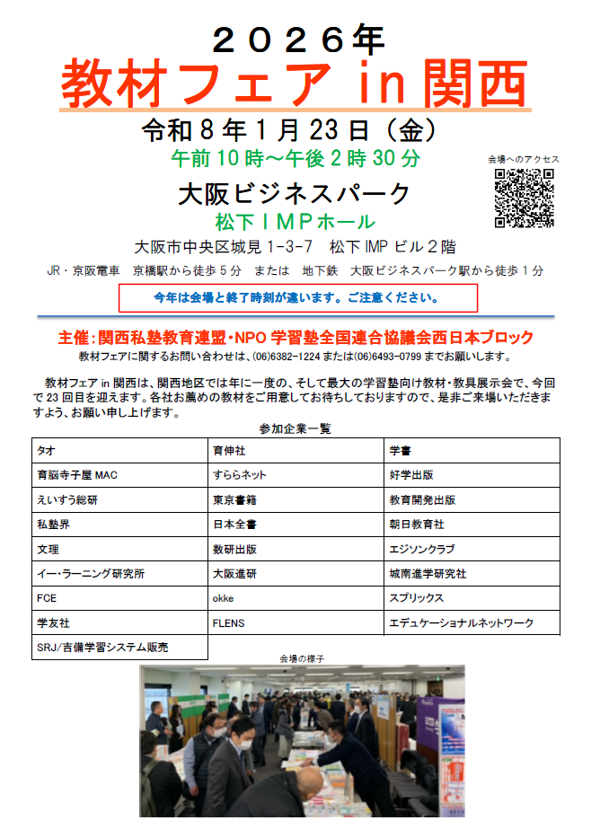 教材フェアin関西は、毎年1月に大阪の京橋で開催される関西最大の教材展です。